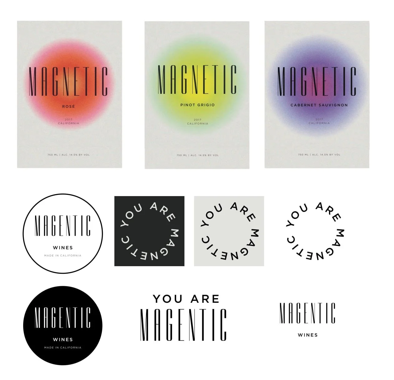 Magnetic Wines was a personal project I developed for fun. I wanted to experiment with gradients and bold colors, and impactful typography. My vision for the brand was sleek and modern. I created various logos and logo stamps, labels, and a website layout.