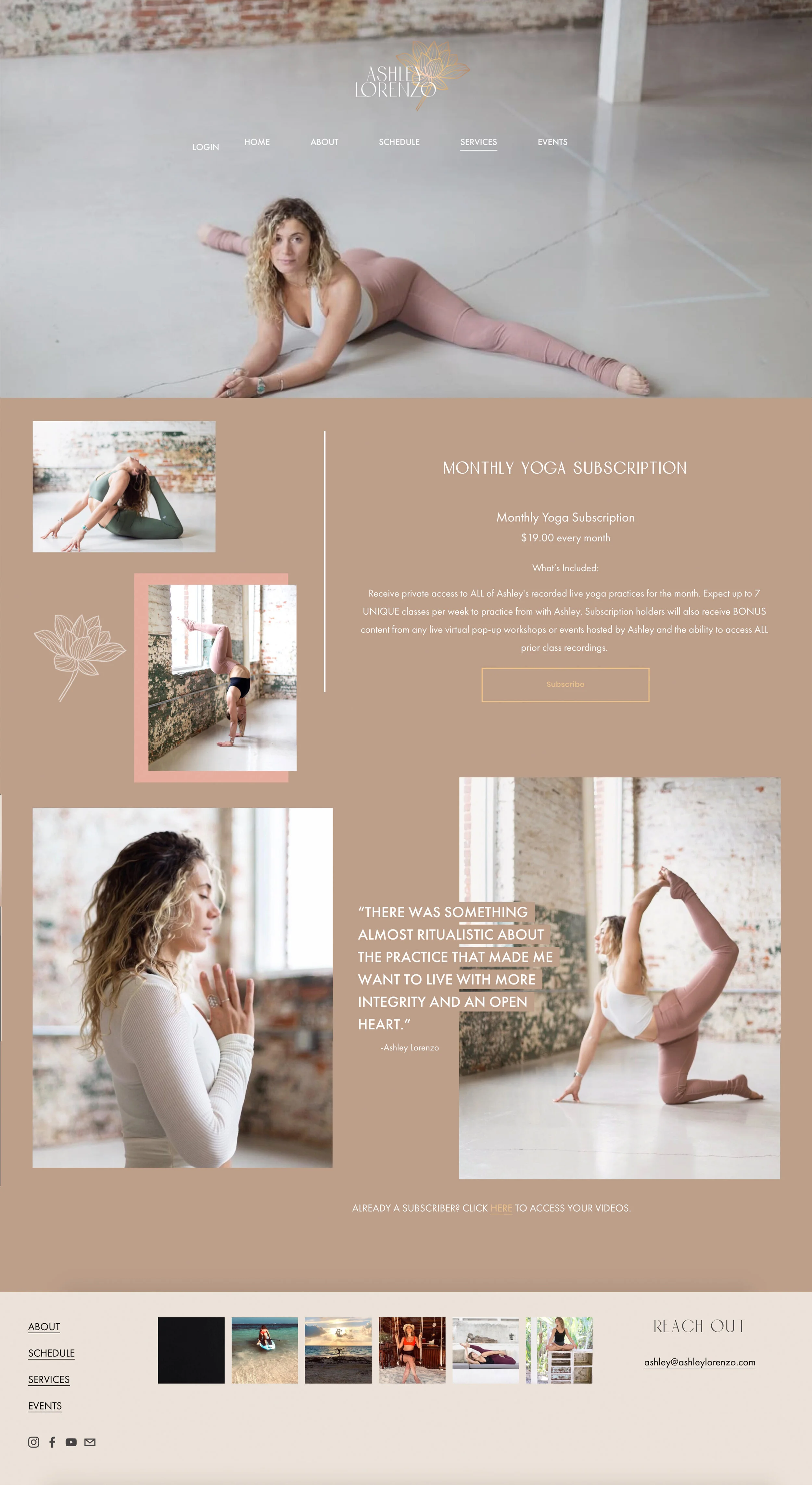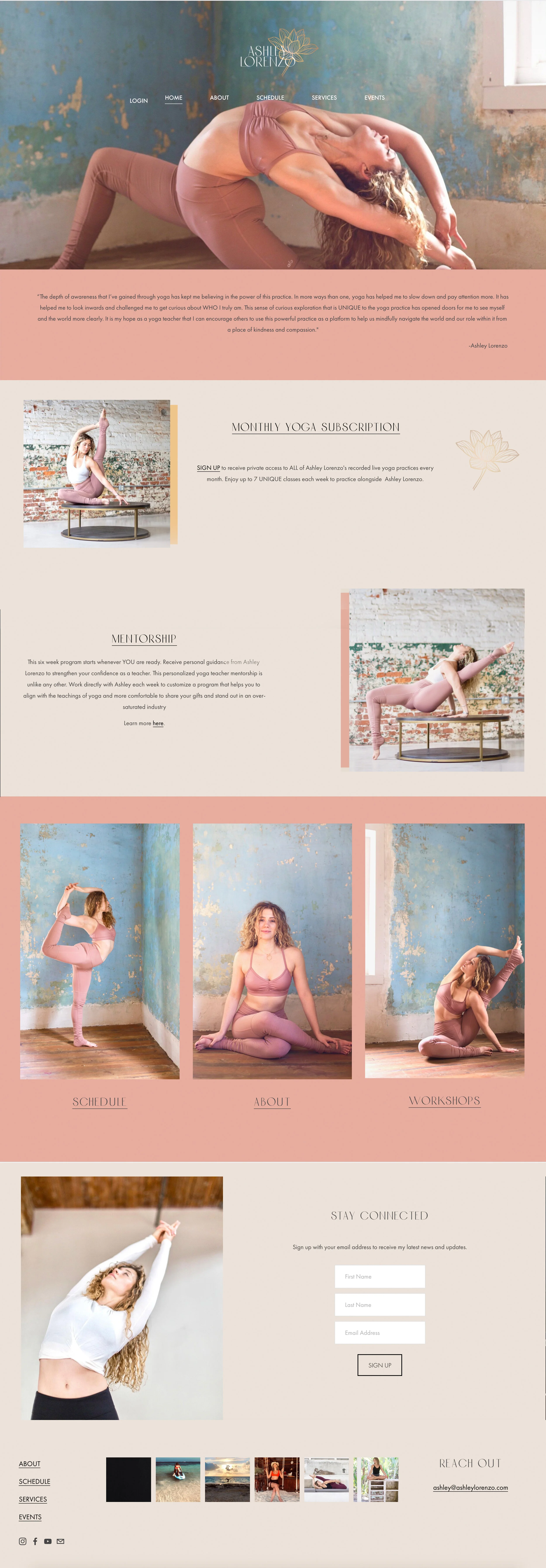 Ashley Lorenzo is an artist and yoga teacher based in Atlanta, Georgia. I worked with Ashley to design a cohesive website layout that was easy to navigate but also authentically reflected her brand. Using pieces that already existed, such as logo and colors, I worked on a layout that made details pop and honored her delicate and graceful image. This project was all about designing and collaborating a home for her business that remained true to her work in yoga. As an artist herself, I helped translate Ashley's vision into a digital platform.